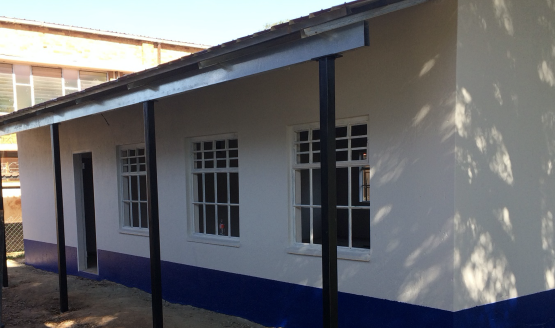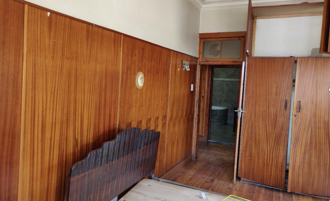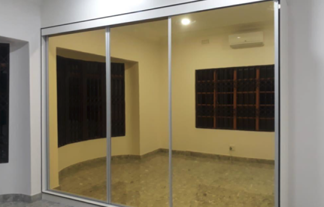 Walk in wardrobe with doors falling off was refurbished with glass doors.